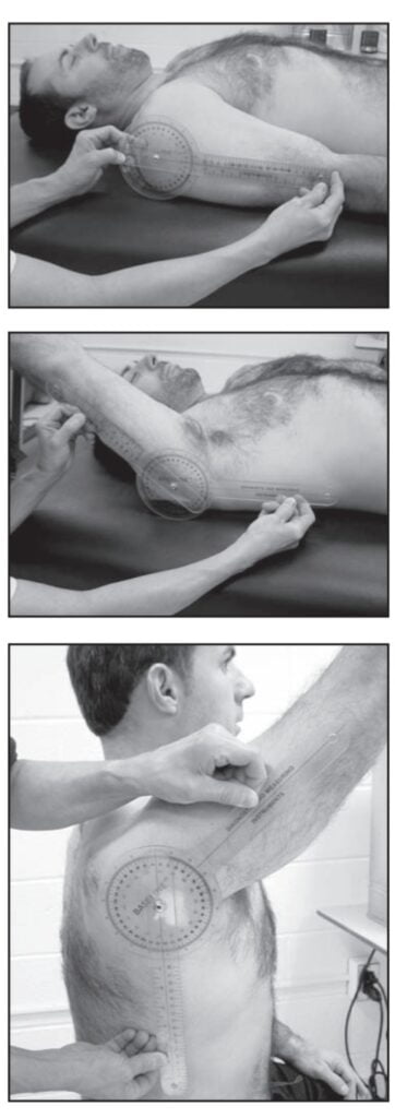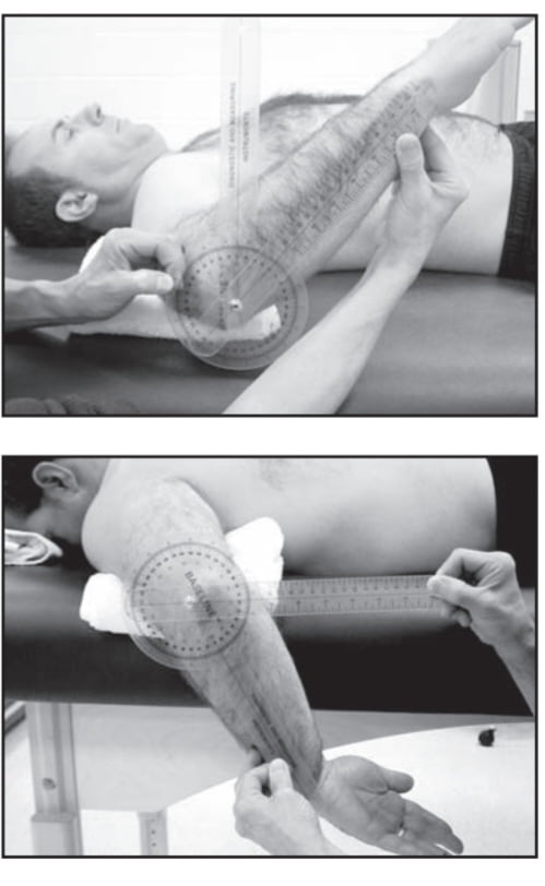Substitutions: The examiner should watch carefully to make sure the subject does not extend the trunk or move the shoulder out of 90 degrees of abduction to avoid movement. Elbow flexion or extension is another commonly seen substitution to avoid shoulder external rotation.