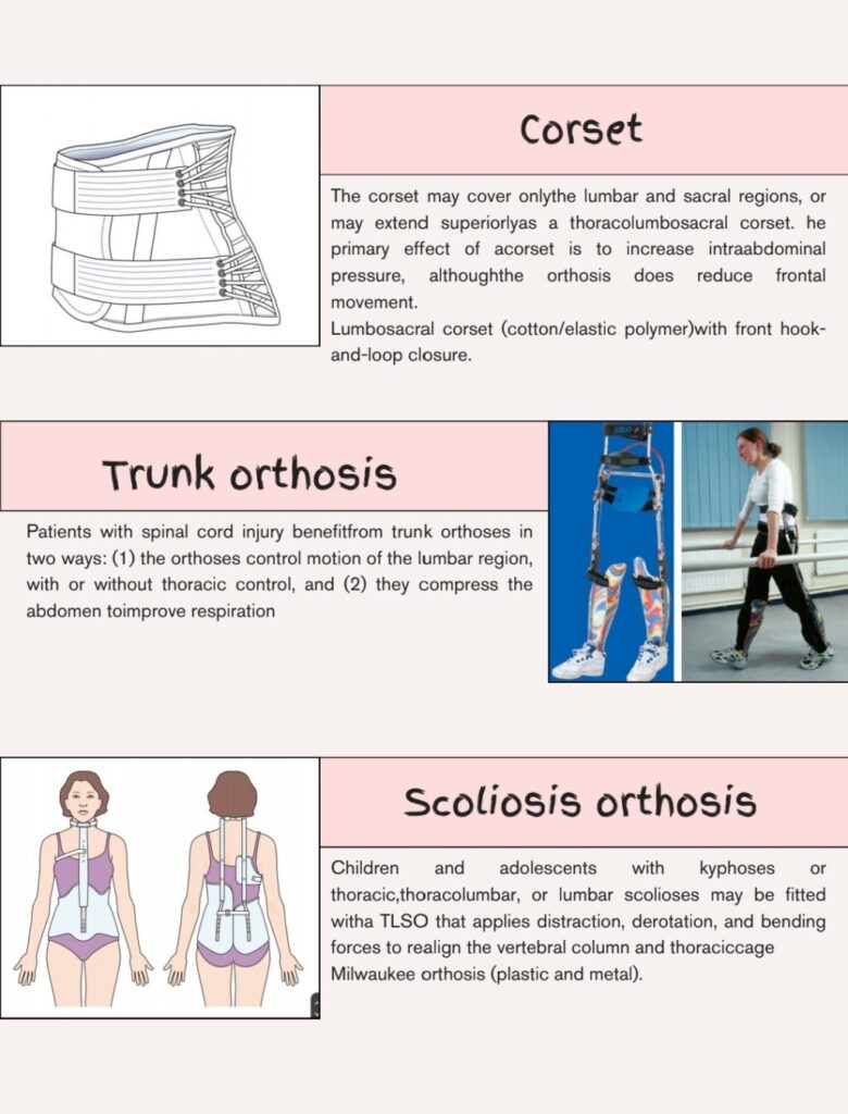 Some common examples of Trunk orthosis are Corsets, Lumbosacral corsets, Lateral Control Orthoses, and Extension Control Orthoses.